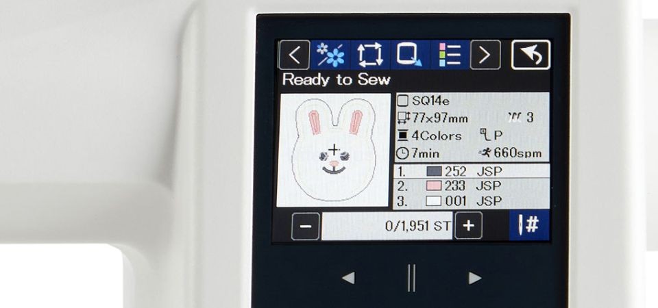 - Możliwość edycji haftów na wyświetlaczu (m.in. zmiana wielkości haftu, obrót, odbicie lustrzane, kopiowanie itp.)