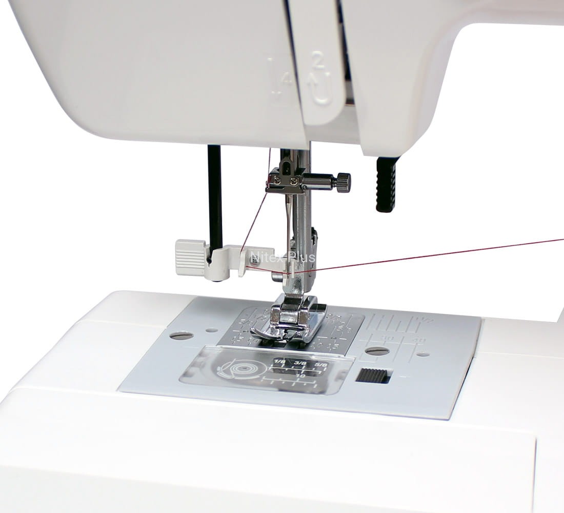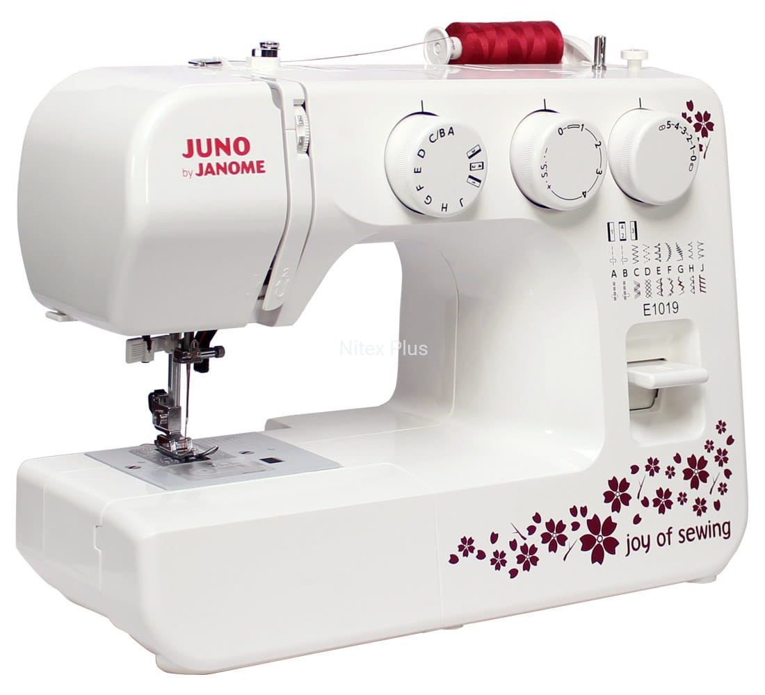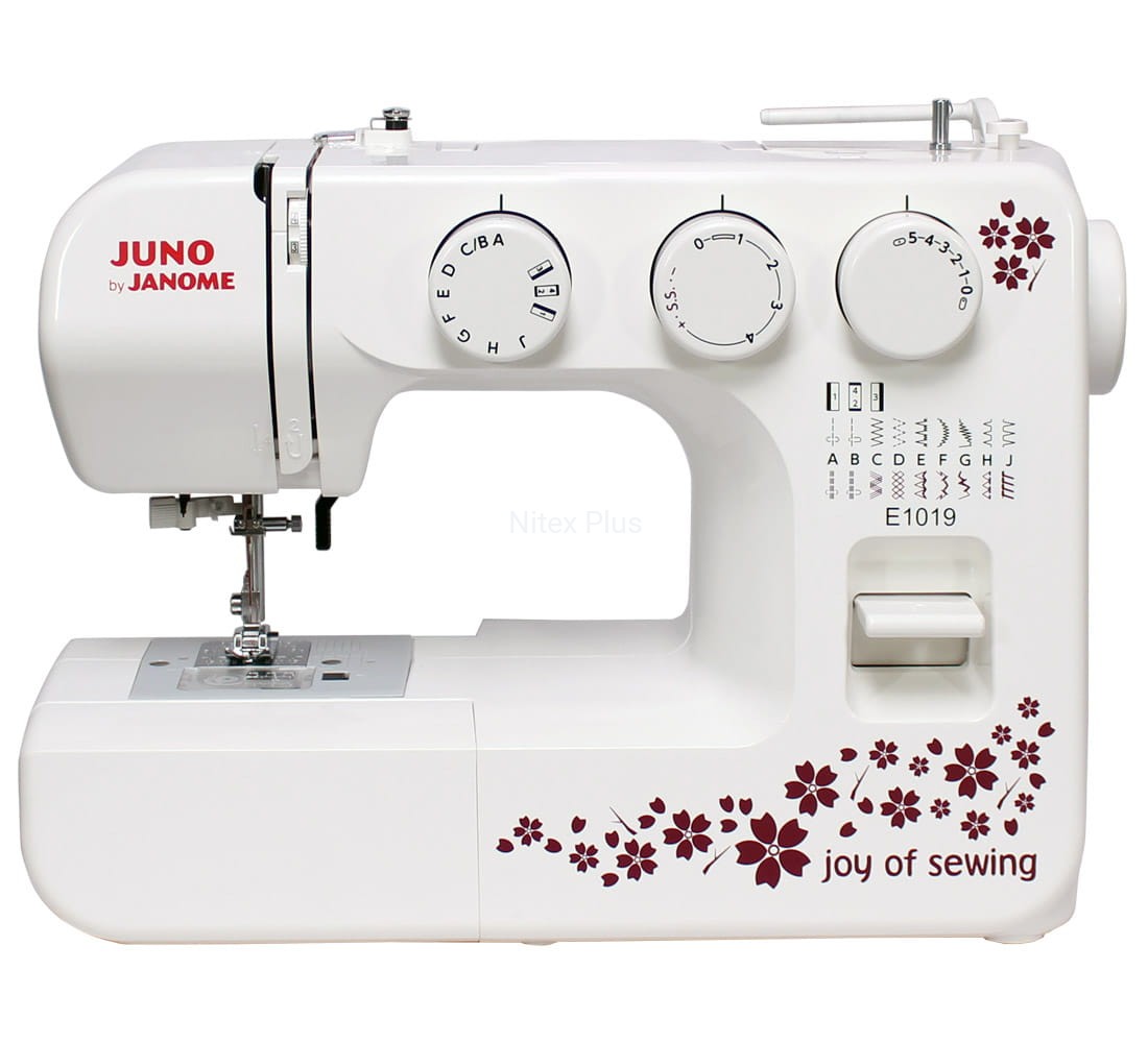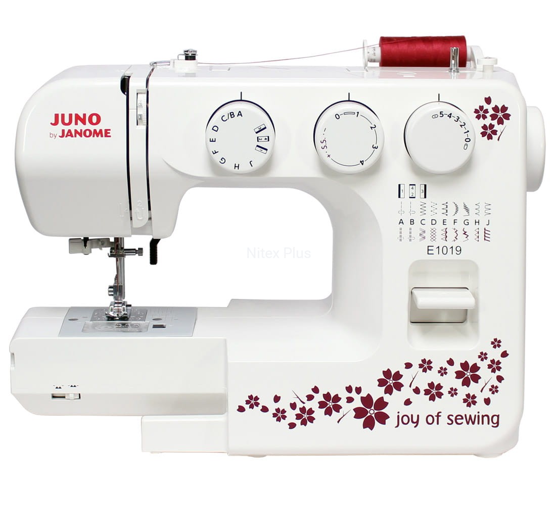 Maszyna do szycia Juno by Janome E1019 posiada kilka praktycznych funkcji, które sprawiają, że szycie na tym modelu jest łatwiejsze i jeszcze bardziej przyjemne. Do takich funkcji należą: nowoczesny chwytacz rotacyjny, dzięki któremu wymiana dolnej szpulki jest łatwa, zajmuje dosłownie kilka sekund, a dodatkowo w czasie szycia możesz stale kontrolować ilość nici na dolnej szpulce; nawlekacz igły, który za Ciebie przeciągnie nić przez oczko w igle; boczny obcinacz nici, dzięki niemu nie musisz sięgać po nożyczki czy wygodny system matic, który sprawia, że wymiana stopki zajmuje kilka sekund i nie potrzebujesz do tego śrubokręta. Na uwagę zasługują także praktyczne linie pomocnicze umieszczone na płytce ściegowej, które pomogą Ci szyć w równych odległościach od krawędzi materiału.