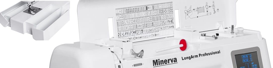 Minerva LongArm Professional oferuje dwa wbudowane duże schowki na akcesoria, w których z łatwością pomieścisz wszelkie stopki, igły, szpulki,… Ponadto, aby zwiększyć komfort użytkowania oraz bezpieczeństwo przechowywania trzpień na szpulkę, szpulownik itp. schowano w obudowie maszyny pod górną klapą, na której znajduje się wzornik dostępnych ściegów. Jest to niesamowicie wygodne rozwiązanie.