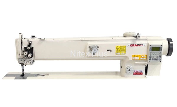 Stebnówka automatyczna długoramienna 1-igłowa z potrójnym transportem (igłowym, ząbkowym oraz stopkowym) do szycia materiałów ciężkich takich jak skóra, tapicerka meblowa i samochodowa. Regulacja wzniosu stopki kroczącej za pomocą wyskalowanej tarczy na głowicy maszyny. Maszyna posiada duży chwytacz o zwiększonej pojemności. Odległość od igielnicy do korpusu maszyny 65 cm. Energooszczędny silnik servo, skrzynka sterująca oraz panel zamontowane w głowicy maszyny.