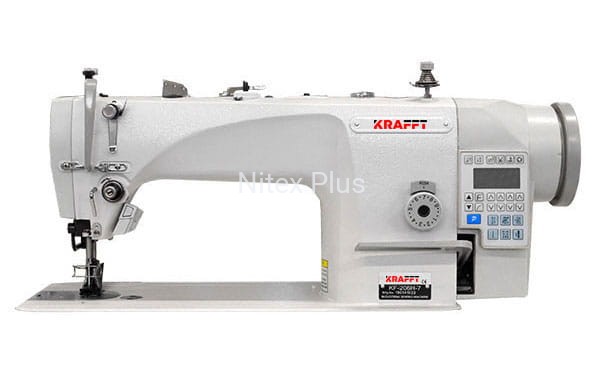 Stebnówka 1-igłowa Kraft KF-206H-7 z potrójnym transportem / ząbki . igła, stopka / oraz funkcjami automatycznymi. Przeznaczona do szycia materiałów ciężkich takich jak skóra, tapicerka meblowa i samochodowa. Bezpośredni napęd (Direct Drive), o mocy 750 W, wpływa na zmniejszenie drgań oraz poziomu hałasu podczas pracy maszyny.