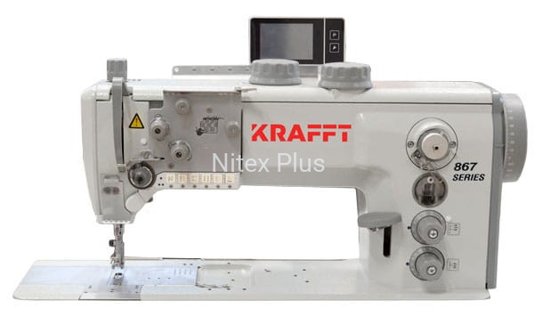 Stebnówka KF-867-121232 1-igłowa z potrójnym transportem (dolny ząbkowy, krocząca stopka, krocząca igła) przeznaczona do szycia materiałów ciężkich. Maszyna wyposażona jest w szereg automatycznych funkcji sterowanych elektro-pneumatycznie tj. obcinanie nici, ryglowanie, podnoszenie stopki, pozycjonowanie igły, programowanie parametrów ściegu np. wielkości i ilości rygli i inne. Sterowanie za pomocą czytelnego i łatwego w obsłudze panelu sterującego umieszczonego na głowicy. Nowoczesny silnik energooszczędny servo zintegrowany z głowicą.