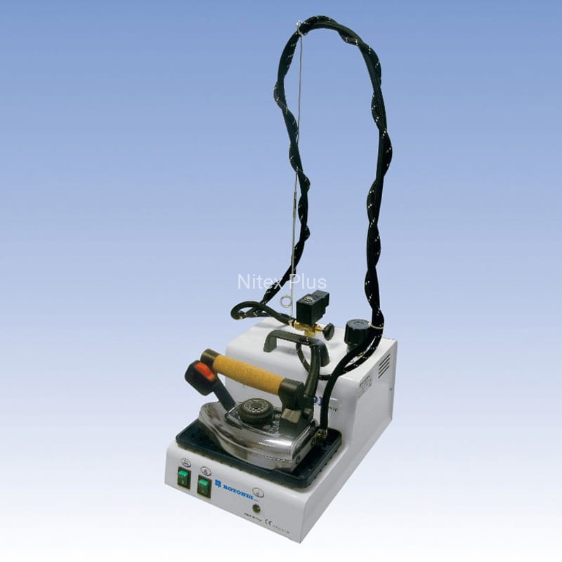 Kompletny zestaw prasowalniczy, składający się z przenośnej wytwornicy pary o pojemności kotła 3,2 L, stołu prasowalniczego oraz przemysłowego żelazka z nakładką stopą teflonową.