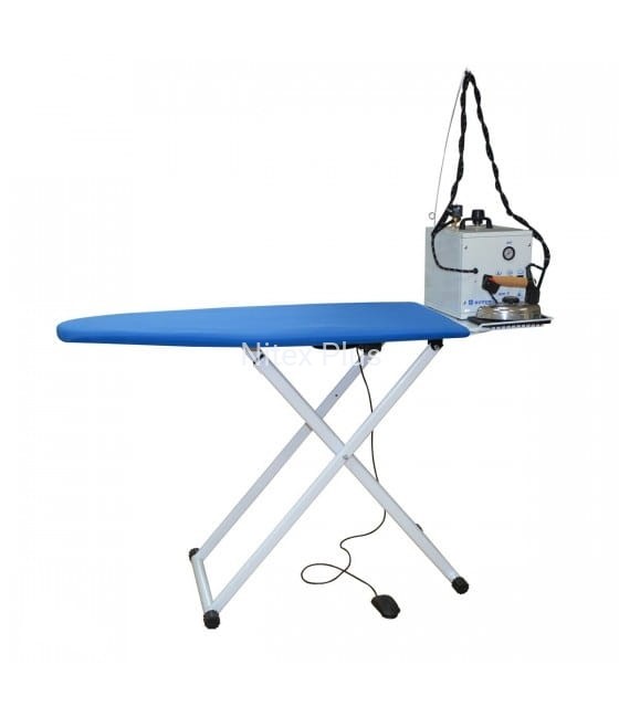 Kompletny zestaw prasowalniczy, składający się z przenośnej wytwornicy pary o pojemności kotła 5,0 L, stołu prasowalniczego oraz przemysłowego żelazka z nakładką stopą teflonową.